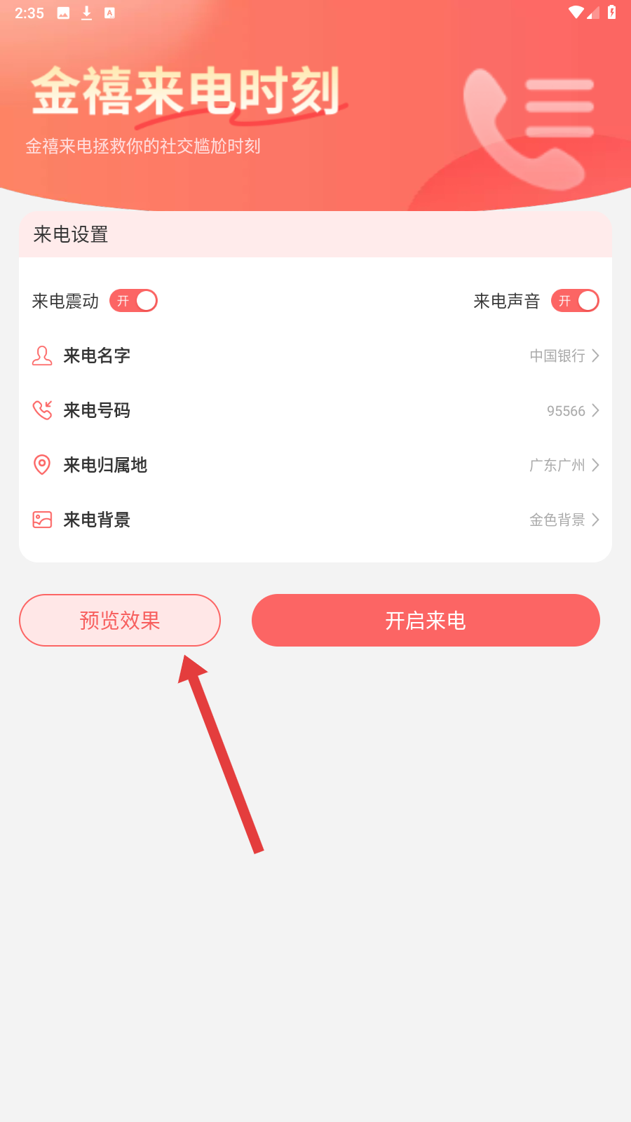 3、在【金禧来电时刻】页,填来电名字、号码等,点【预览效果】看样式。