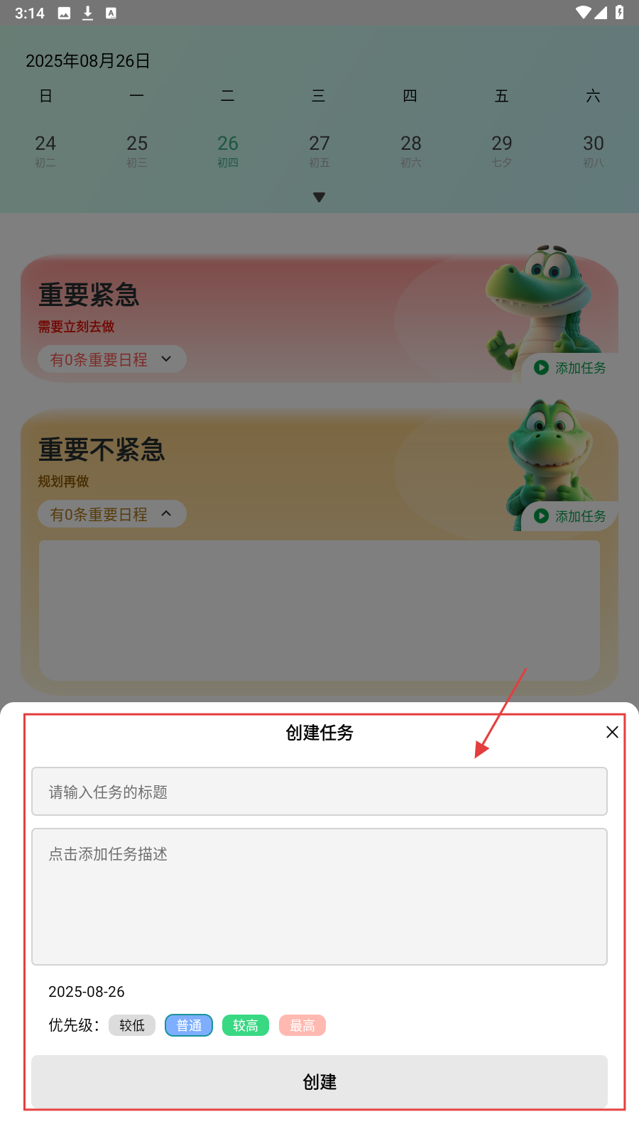 4、填任务标题、描述,选优先级,点【创建】,高效安排日程事项。