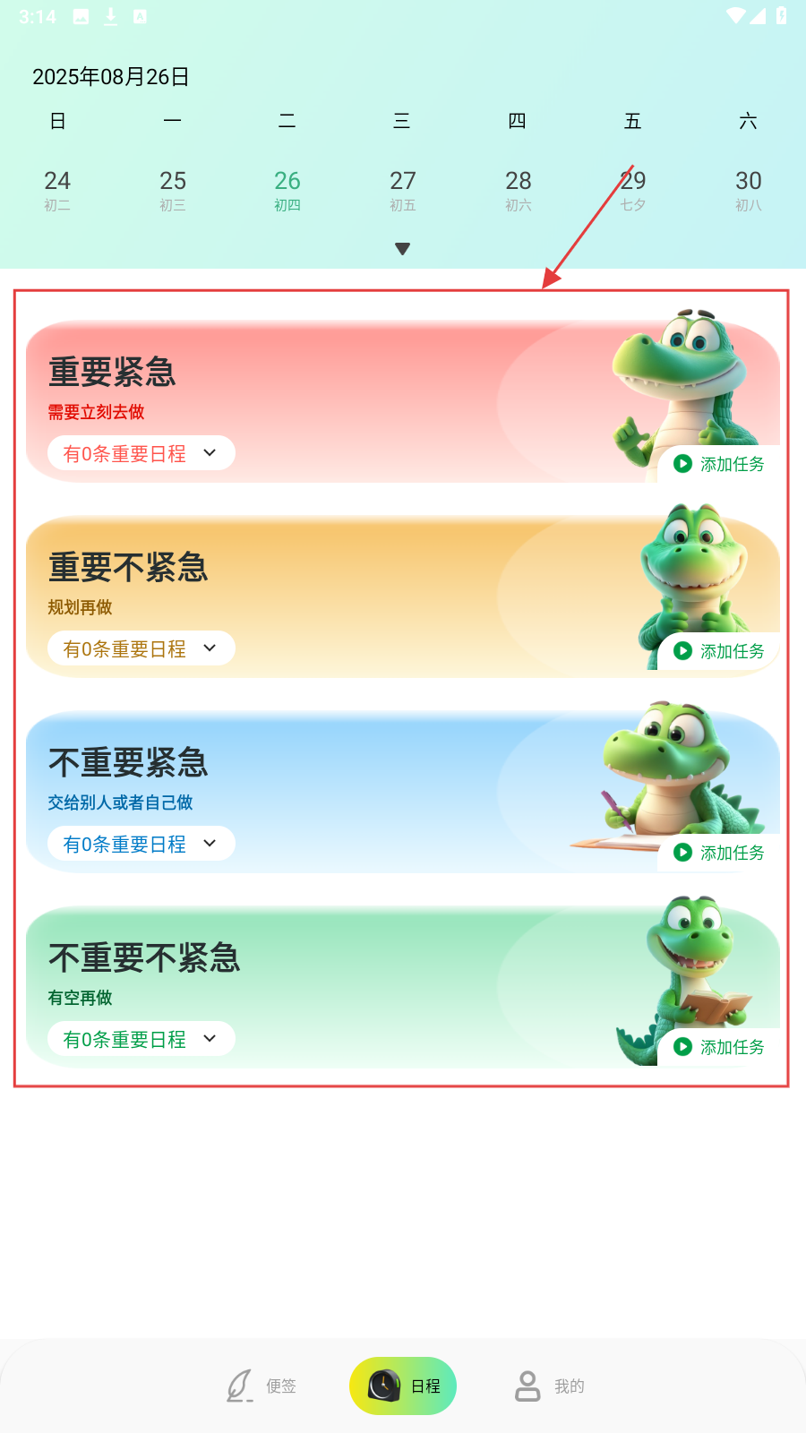 3、切【日程】页,按任务分类(如重要紧急),点【添加任务】规划。