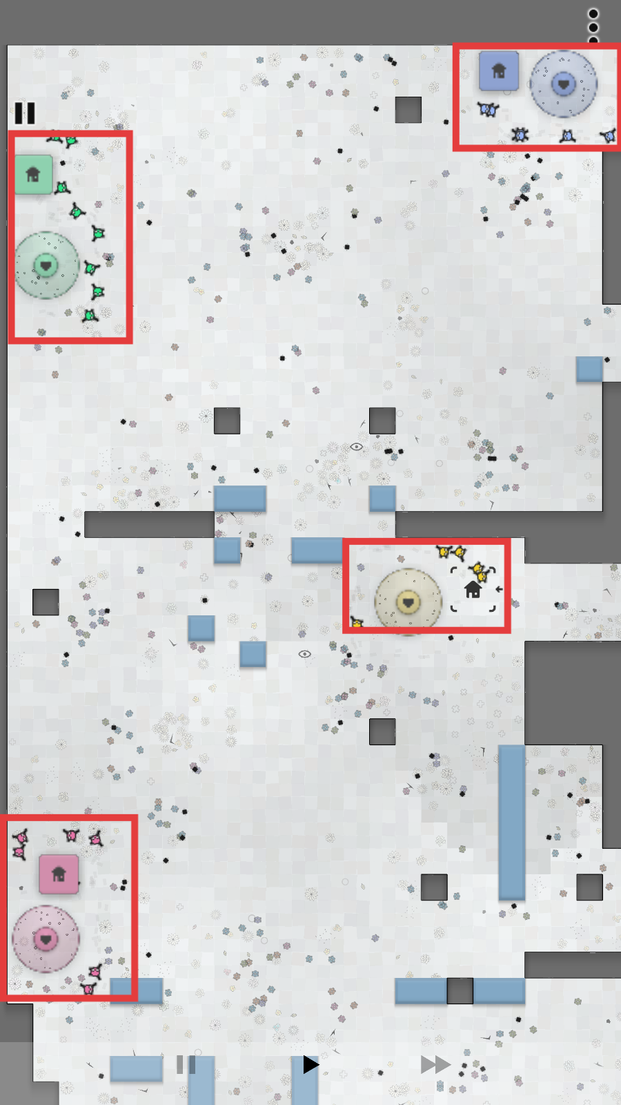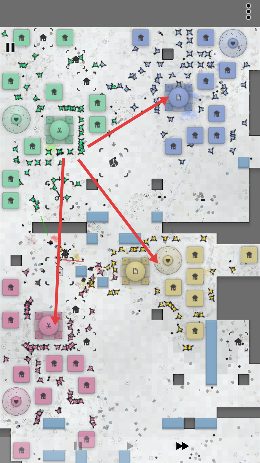 3、战斗中指挥绿色单位,向黄、蓝、粉阵营区域推进,抢占对方据点,扩大己方控制范围。