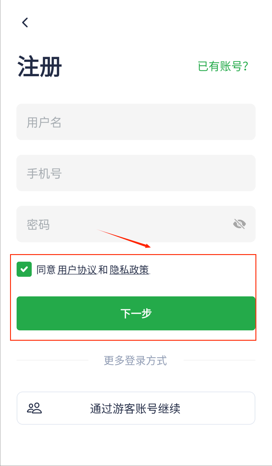 3、注册时要记得勾选同意用户协议和隐私政策,不然无法完成注册。那个绿色下一步按钮很醒目,点击就能进入下一步。