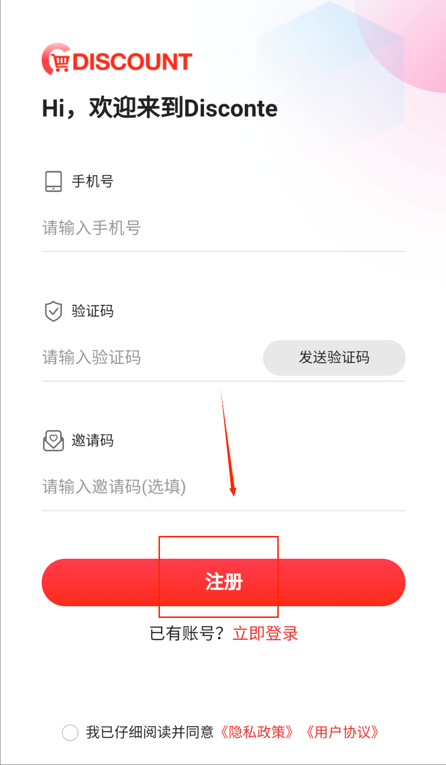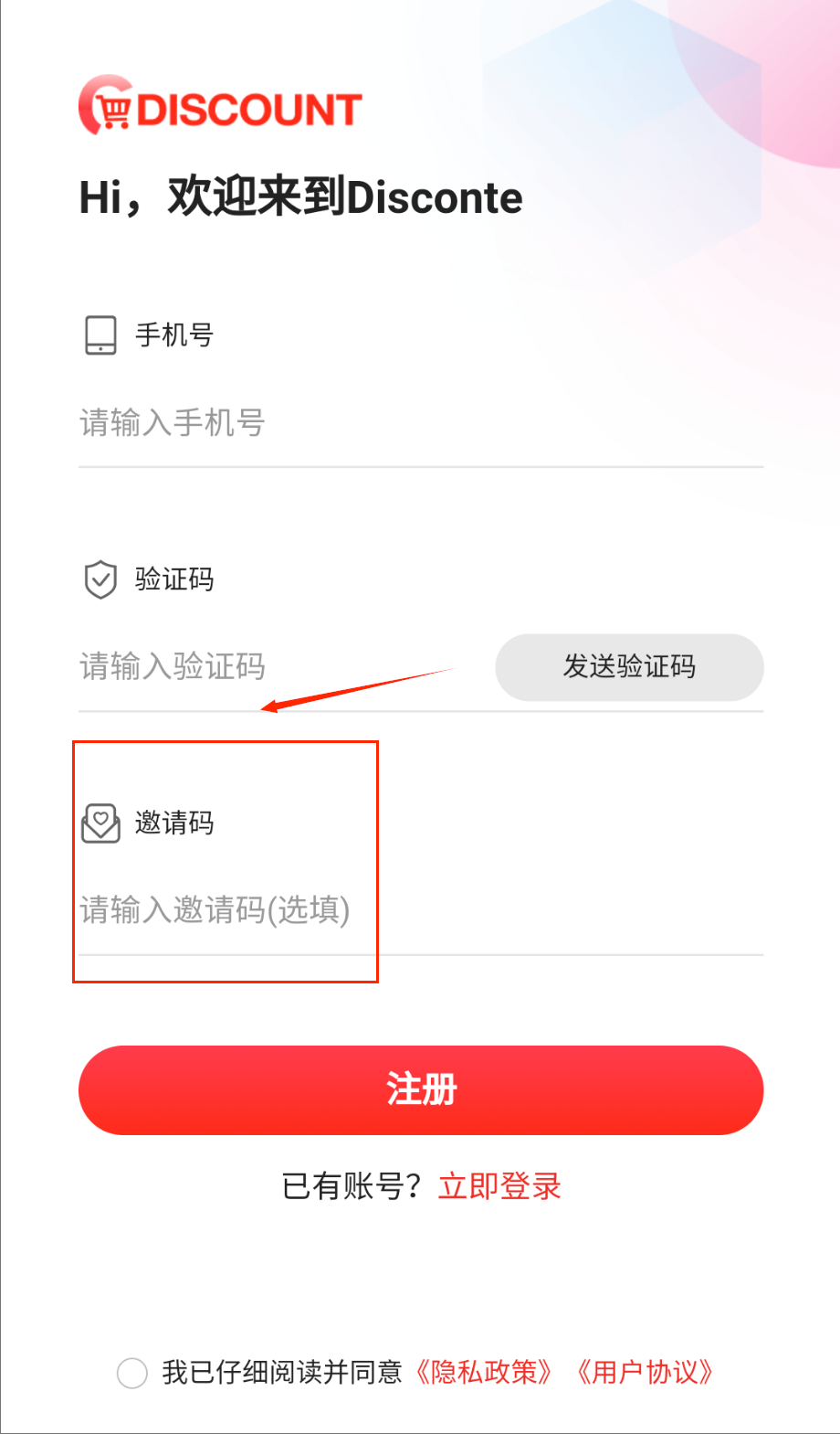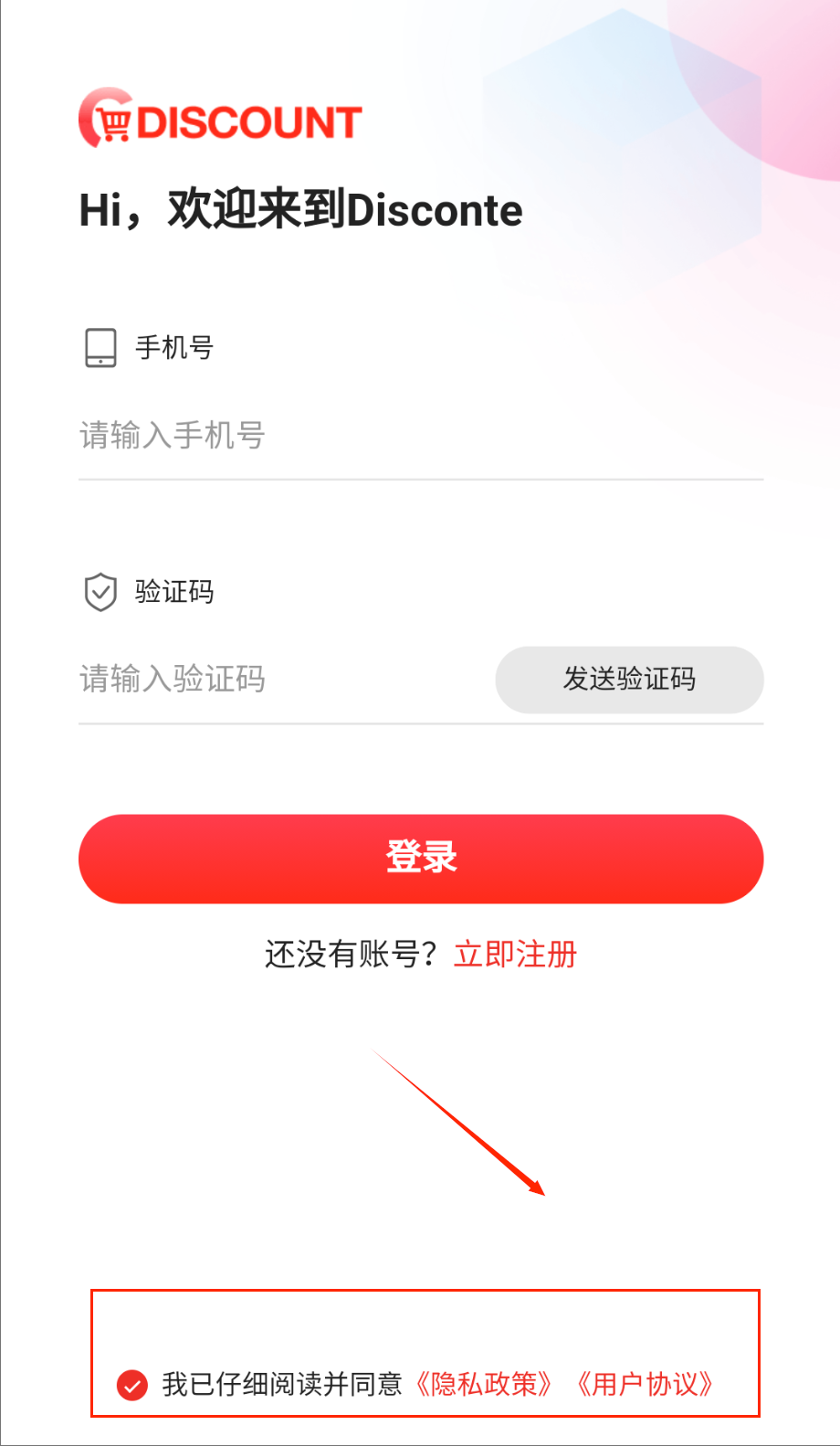 1、打开Discount软件后首先会看到非常简洁明了的登录界面,在页面中央找到手机号输入框并准确填写你的11位号码。