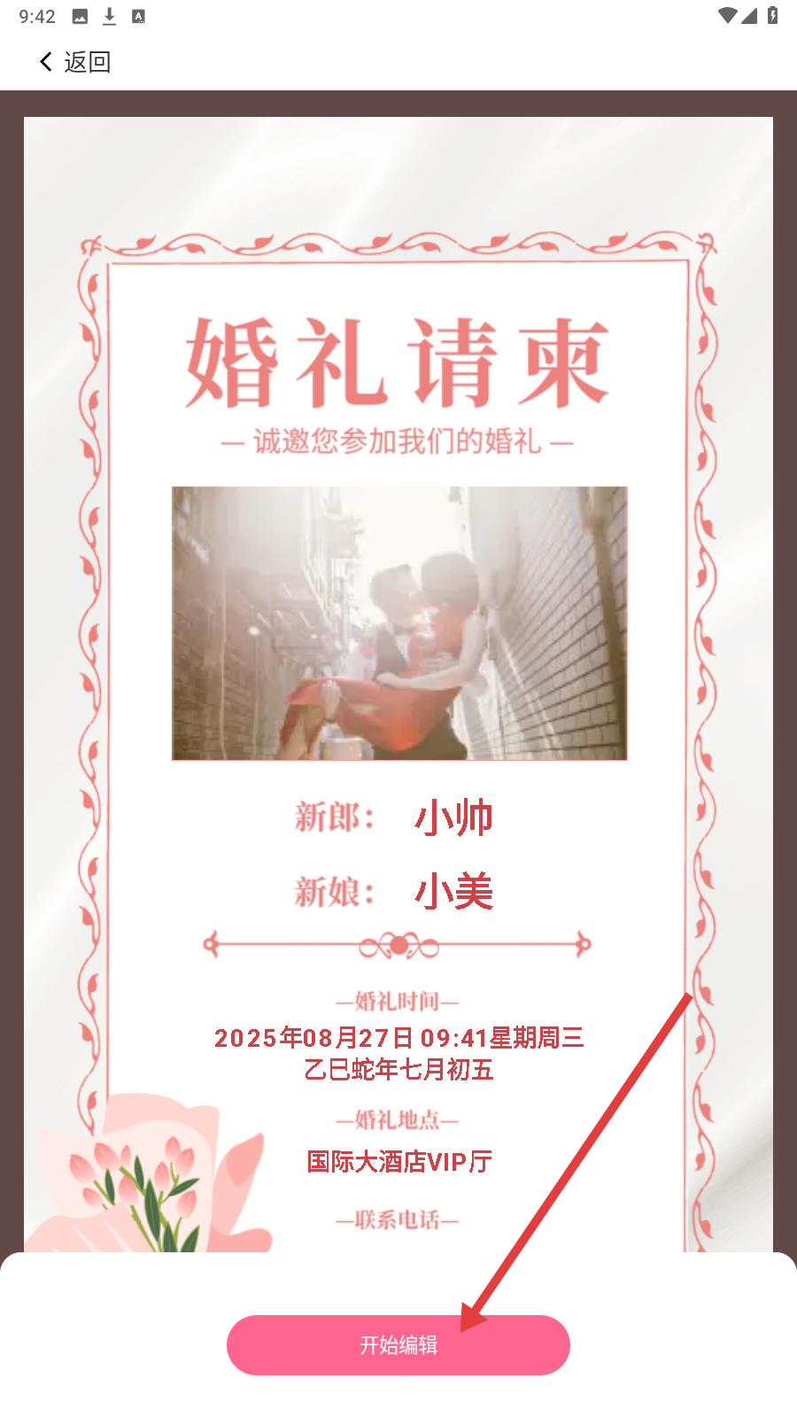 2、点【开始编辑】,填新郎-新娘-日期-地址-联系方式等信息,完善请柬。