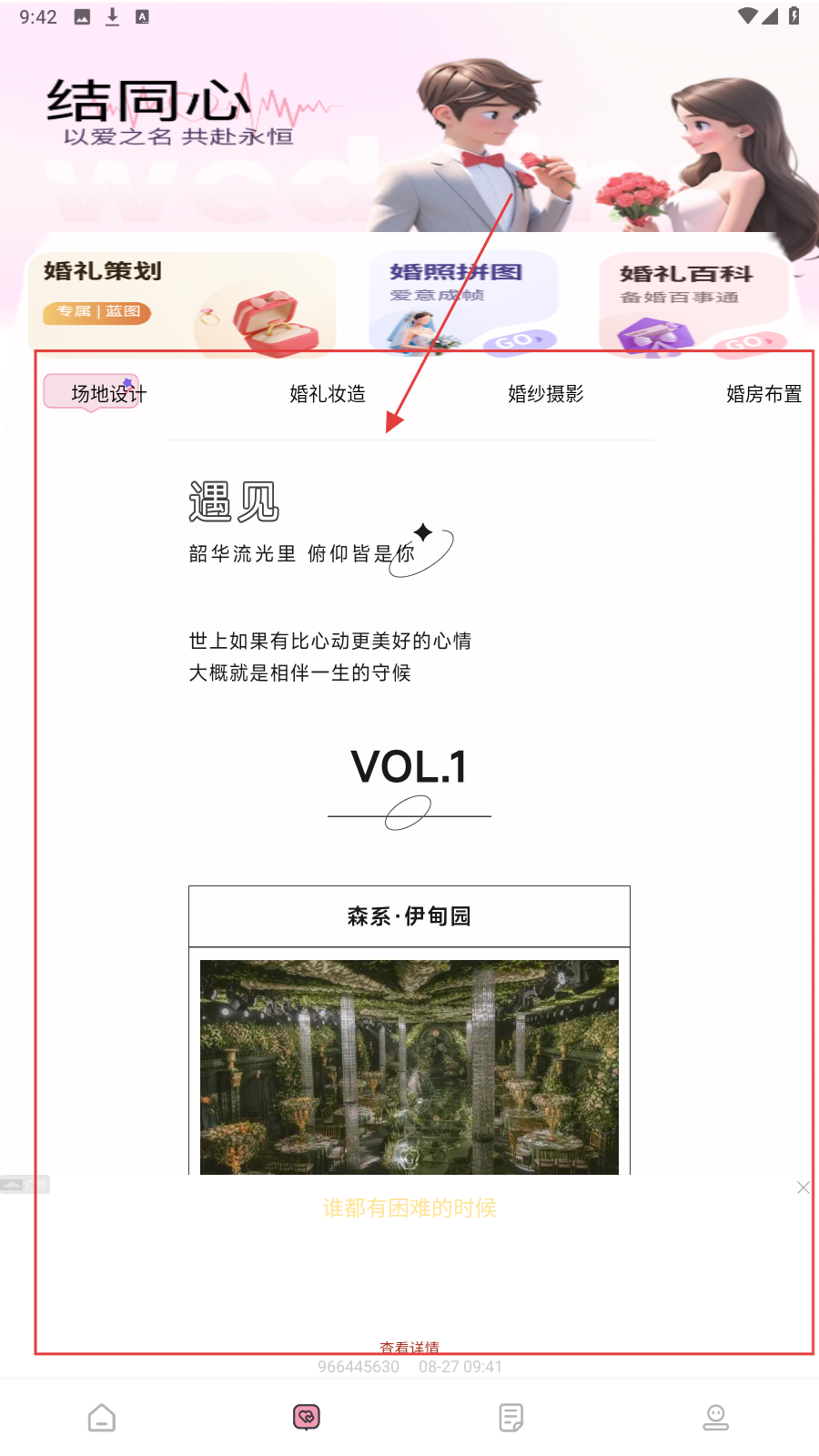 4、切婚礼策划页,选场地设计(如森系伊甸园),参考布置灵感备婚。