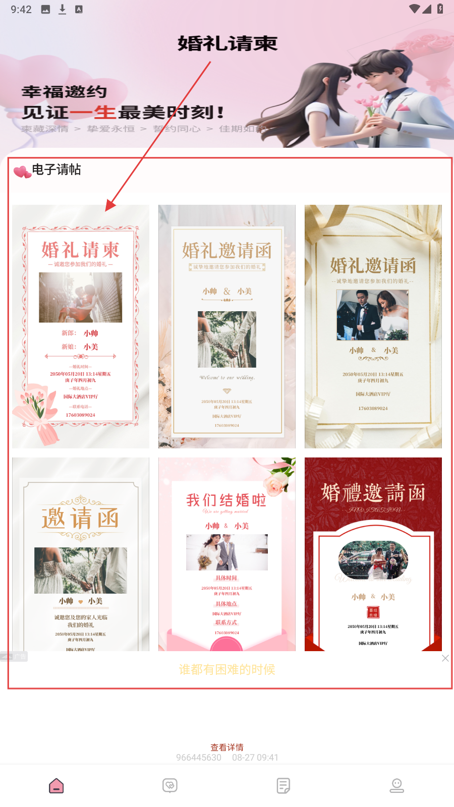 1、进入App选婚礼请柬模板,挑心仪样式(如粉色边框款),开启制作。