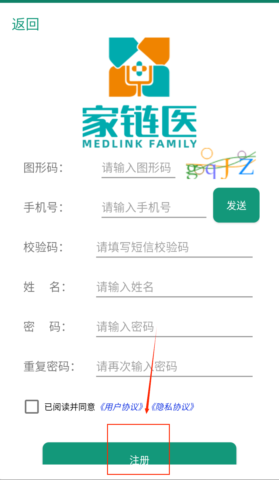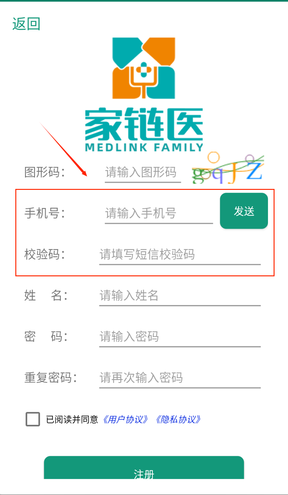 1、打开软件进入注册页面,在图形码框里输入显示的四位字母,可以点击发送获取手机验证码呀。