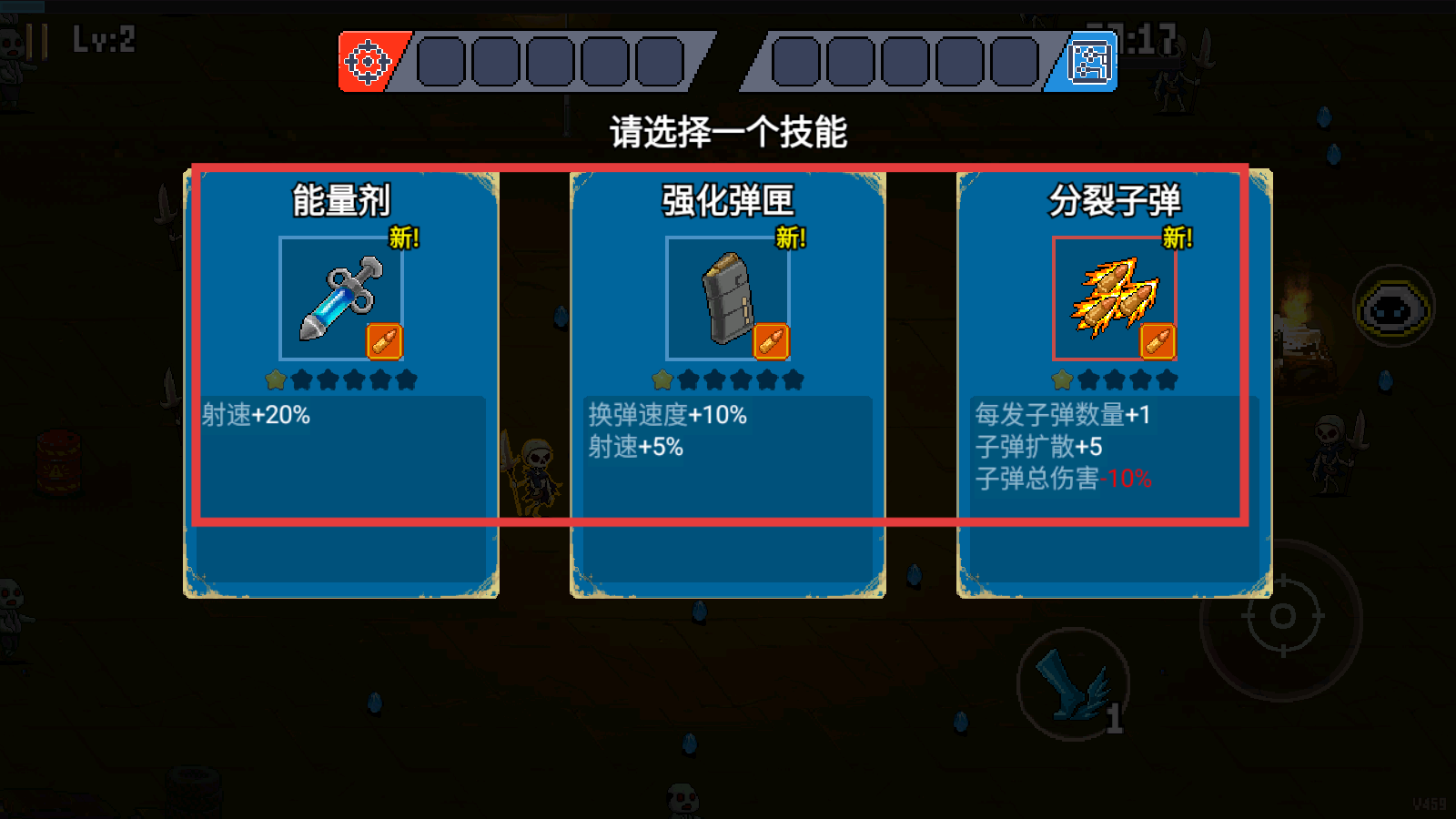 4、技能升级选择:根据局势优先升级核心技能,提升战斗力,应对越来越强的敌人挑战和关卡难度。