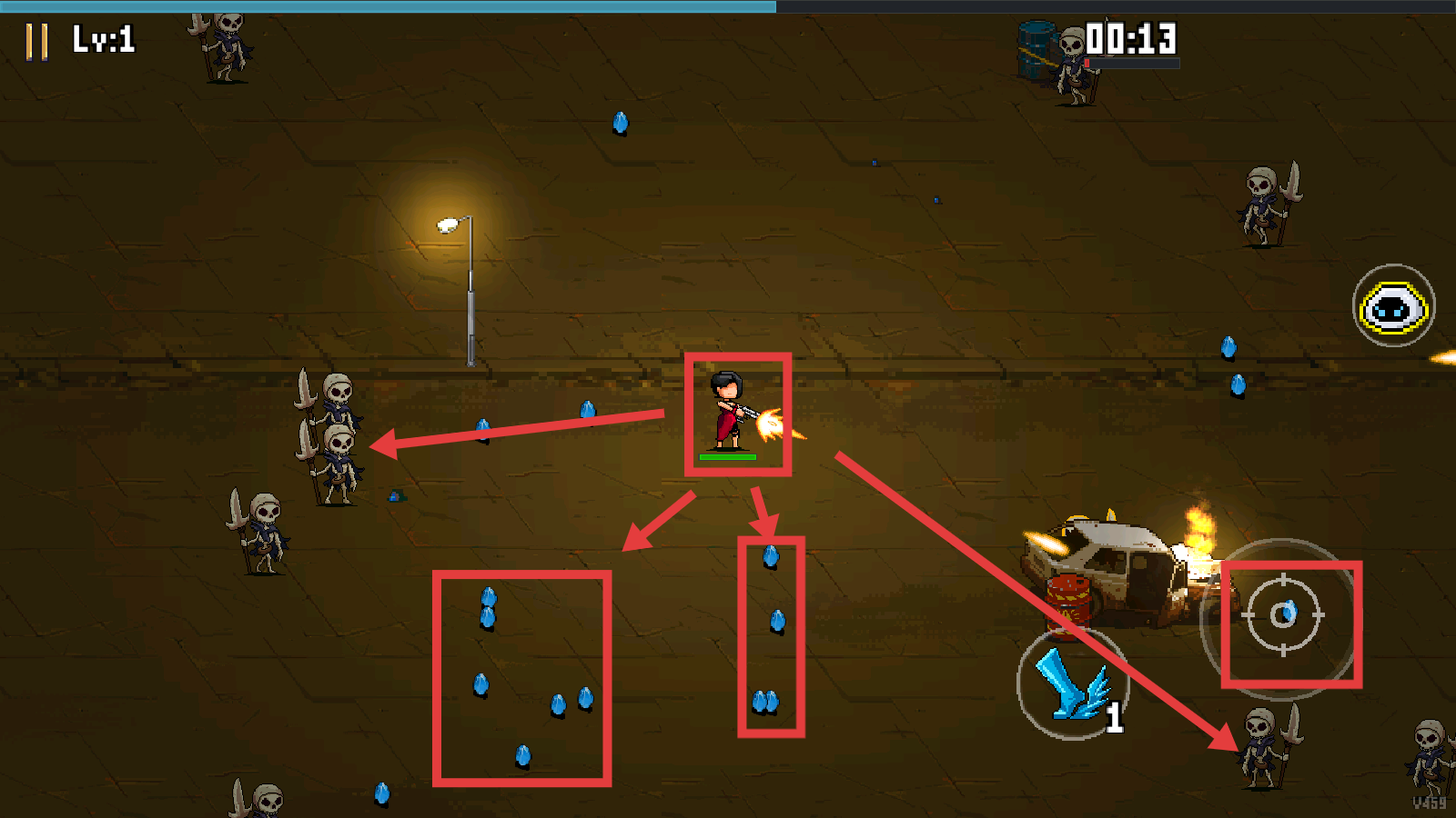 2、战斗时控制角色走位,躲避骷髅怪,射击同时收集蓝色水滴道具。