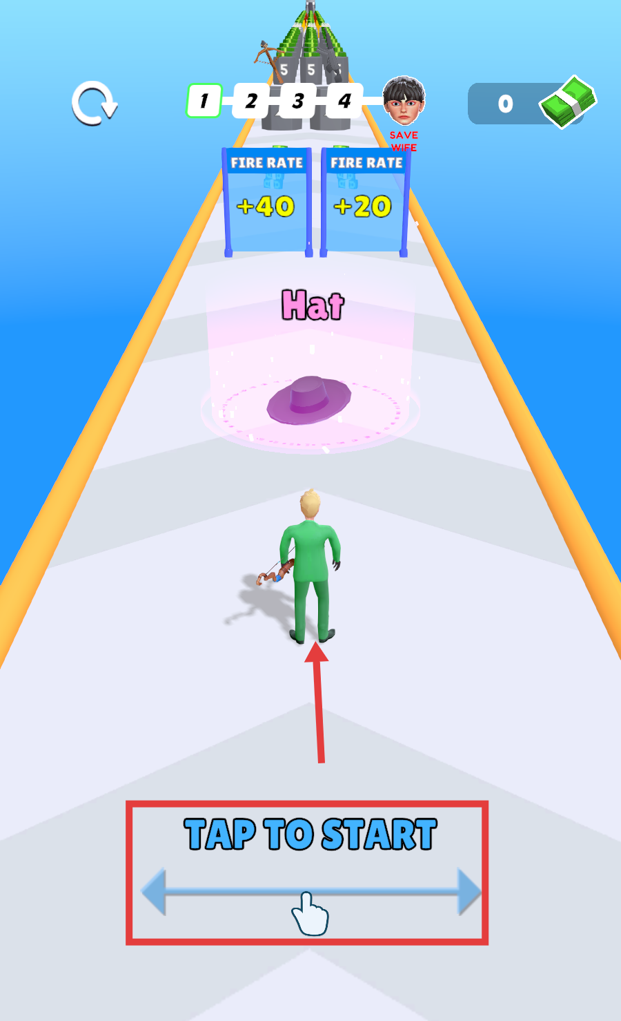 1、点击【TAPTOSTART】,控制角色沿轨道前进,优先拾取【Hat】等道具。