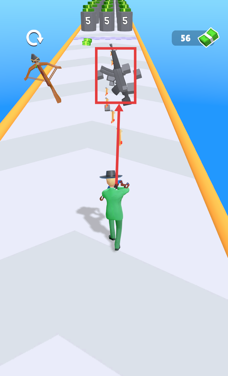 2、奔跑时瞄准两侧【绿色钞票】,左右移动角色尽可能全部收集。