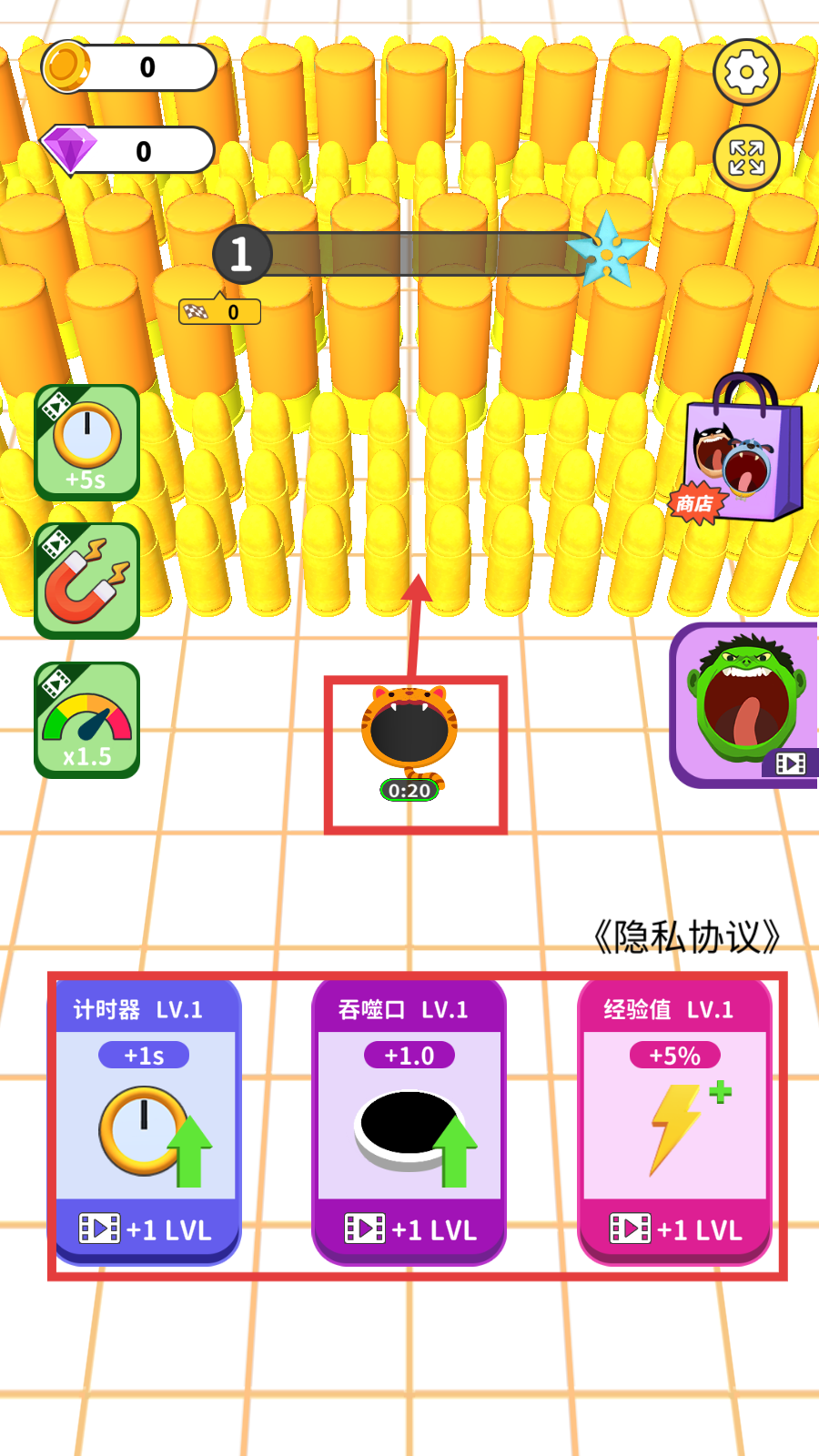1、开局优先升级【吞噬口-LV.1】,扩大吞噬范围,快速吞取黄色子弹道具,积累资源。