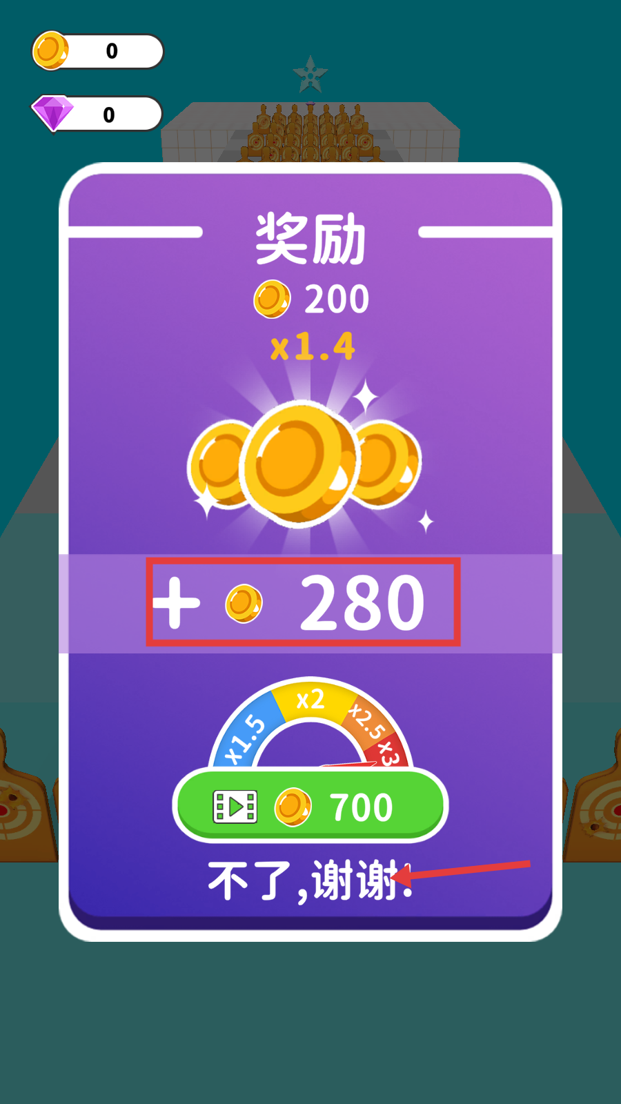 4、通关后出现奖励界面,若不想看广告,直接点击【不了,谢谢!】领取基础金币奖励。