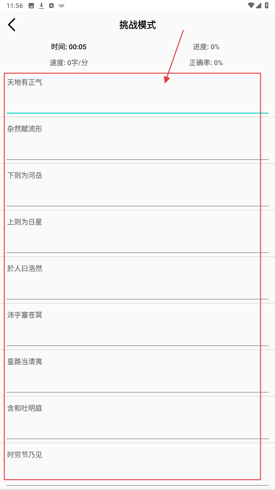 2、进入【挑战模式】,按诗词文本【天地有正气】等,快速准确打字。