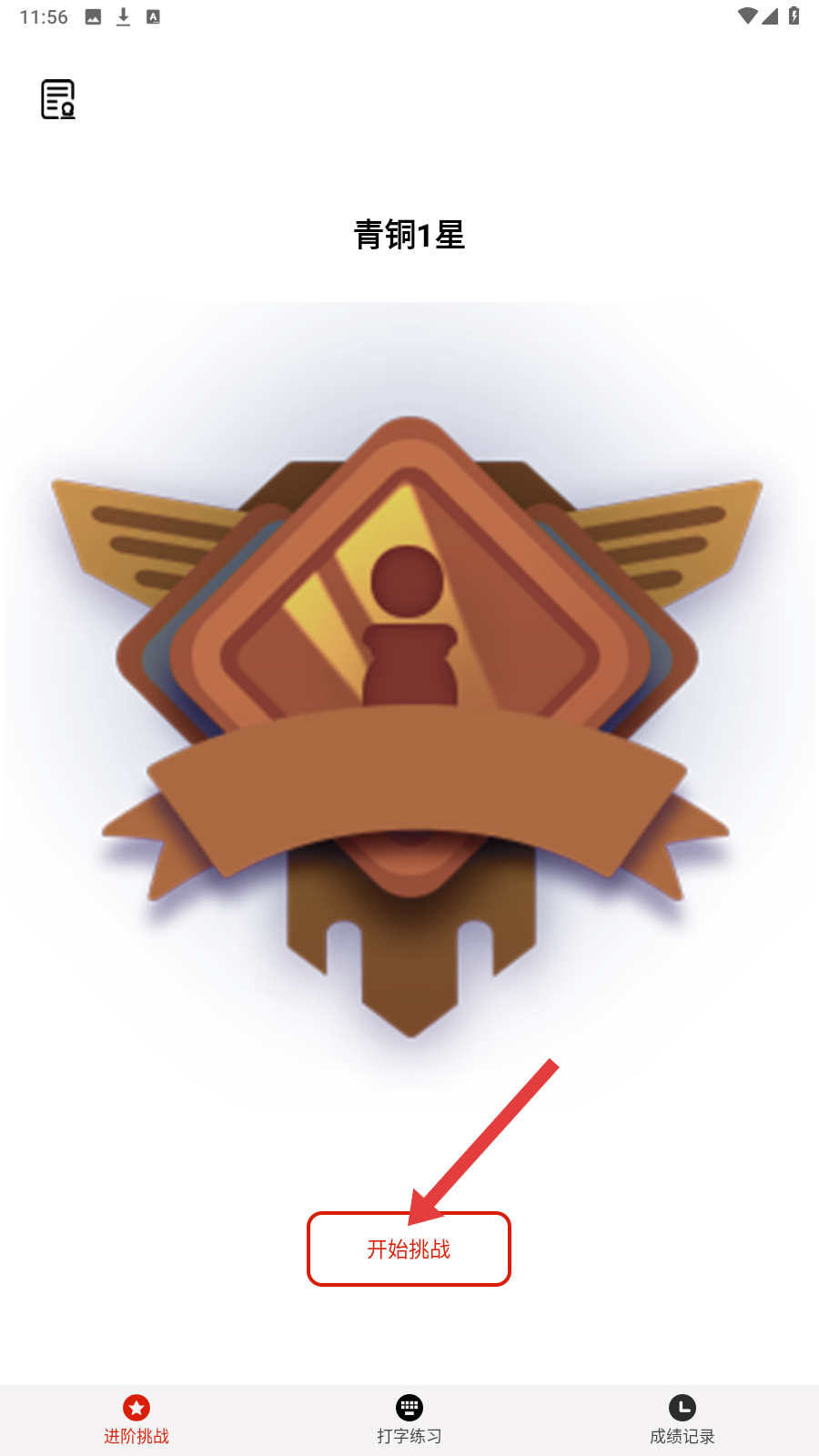 1、在【进阶挑战】页,点【开始挑战】,参与【青铜1星】打字挑战。