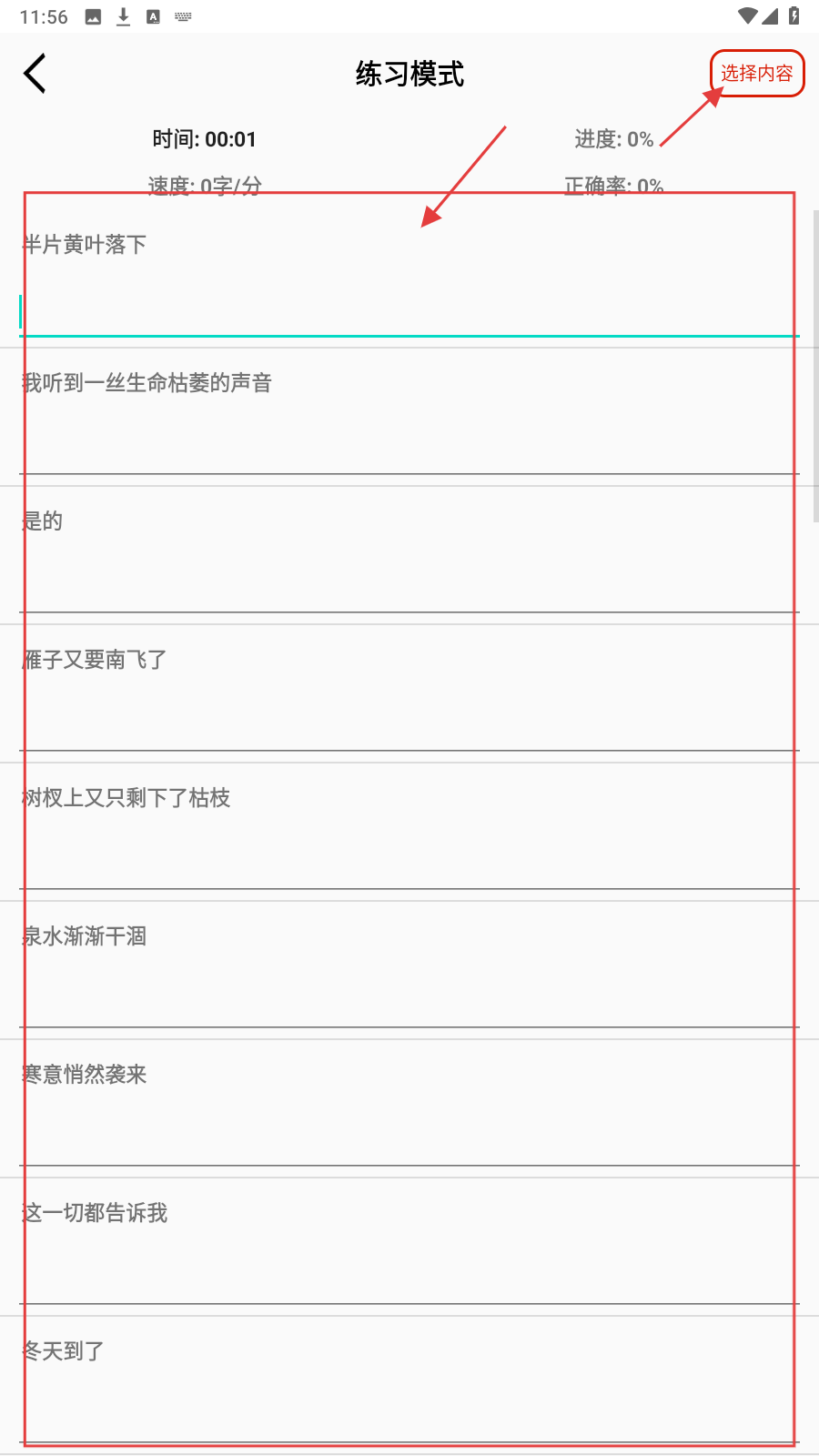 4、在【练习模式】,可点【选择内容】换文本,丰富打字练习素材。