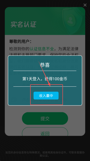 2、完成“实名认证”,点“提交”后立即领取“第1天登入”赠送的100金币。