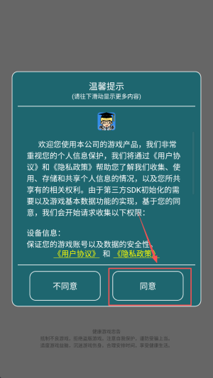 1、阅读温馨提示,滑到底后点击“同意”,进入游戏主界面。