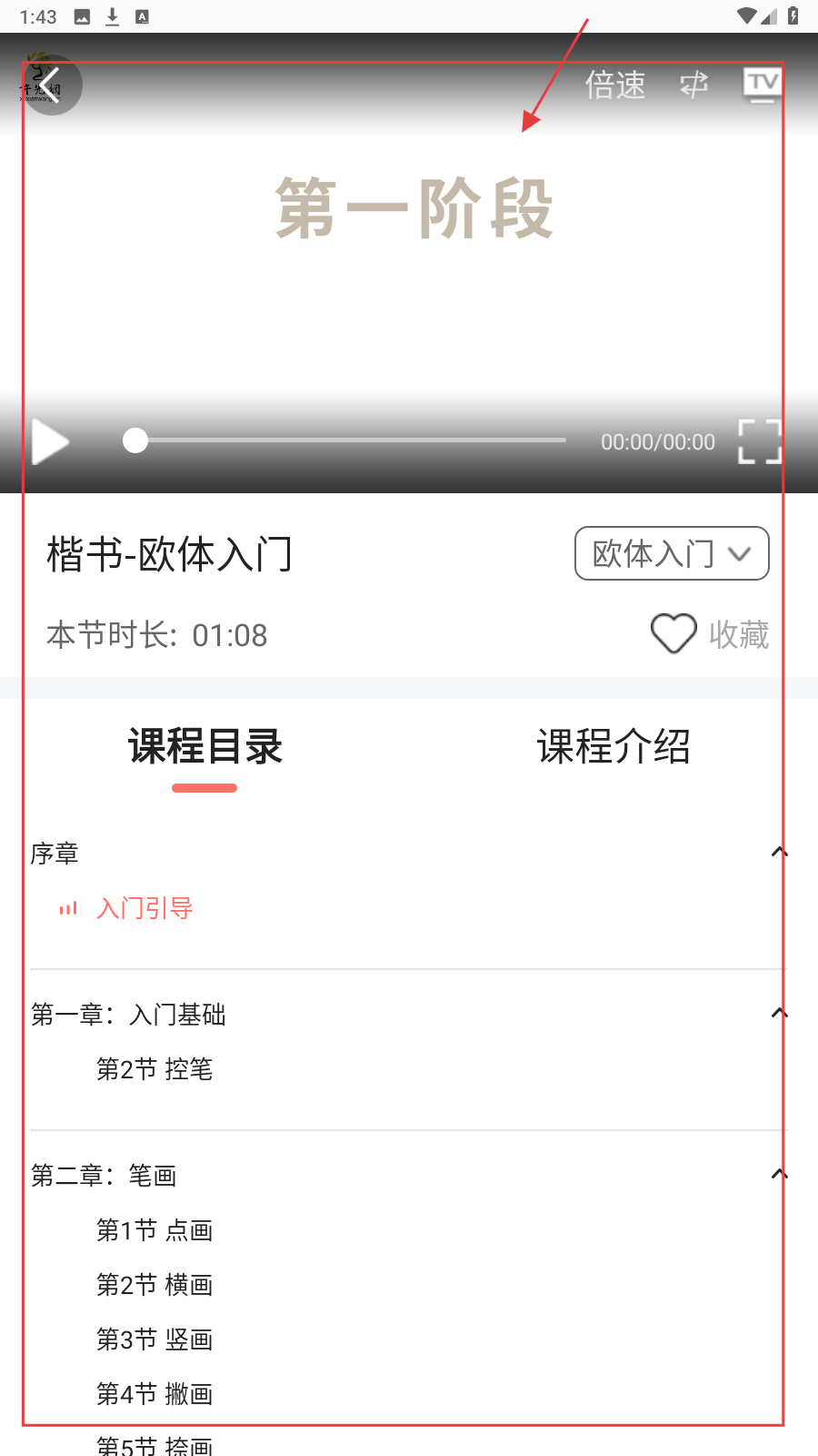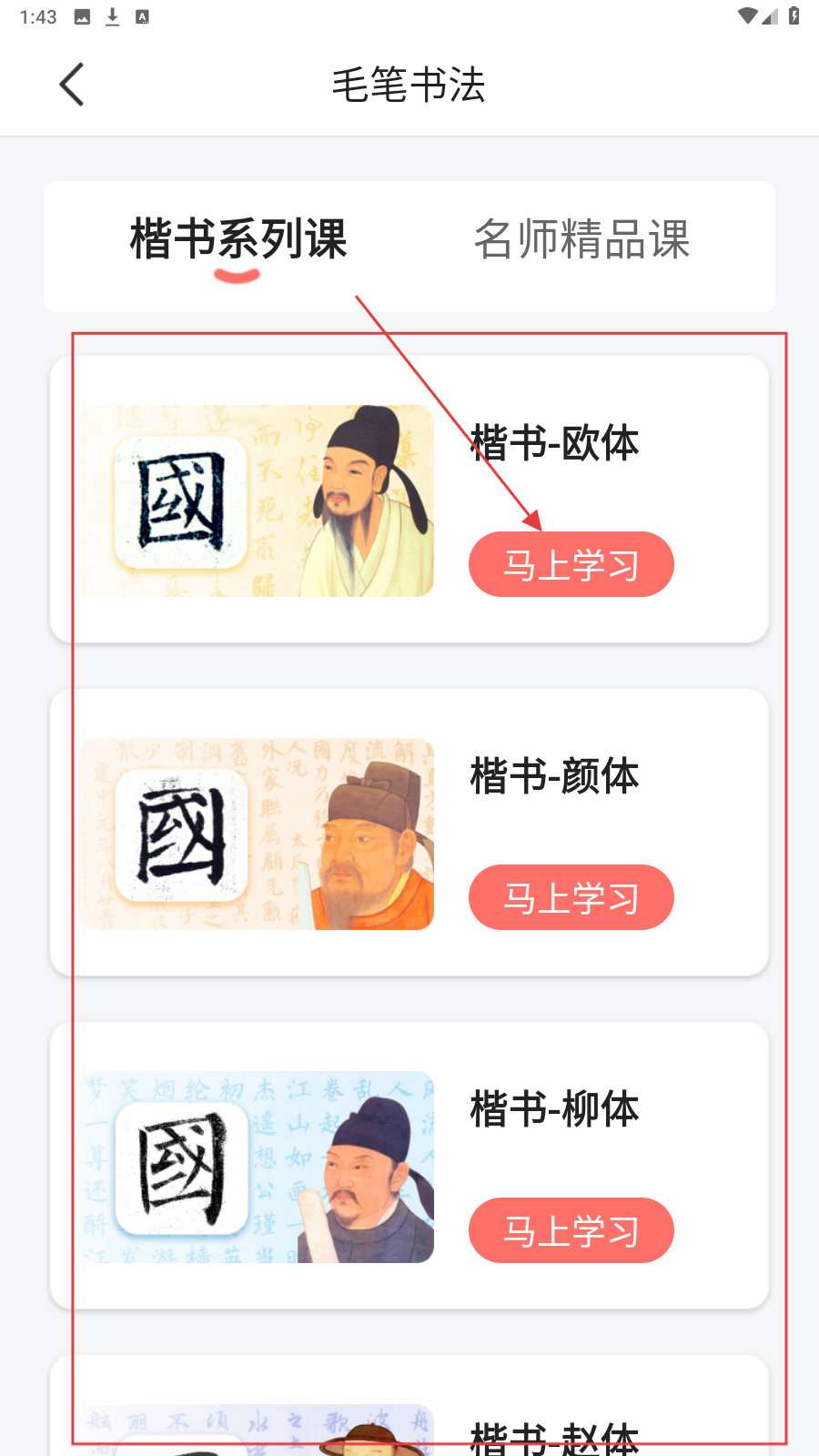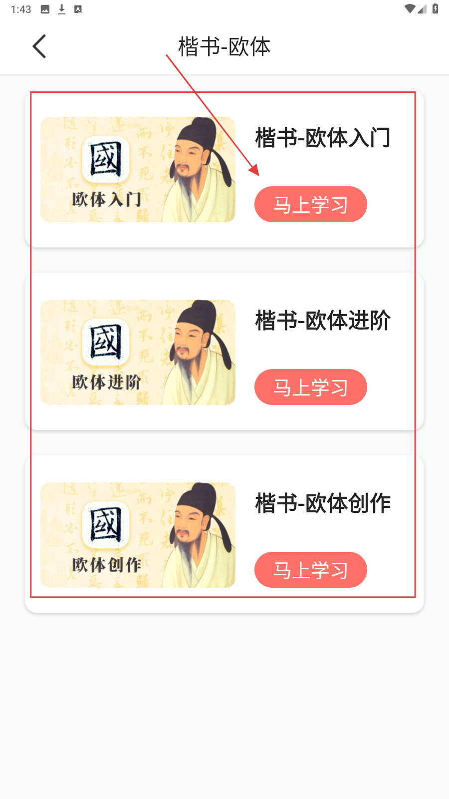 3、课程页选【楷书-欧体入门】,点【马上学习】,从基础内容学起。