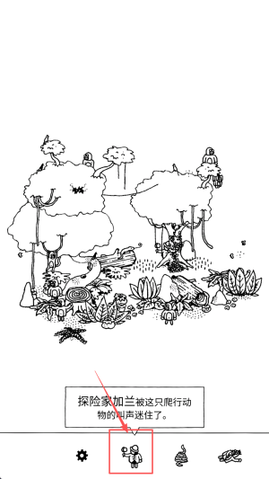 2、探索互动场景:在黑白手绘场景中移动视角,通过卷起帐篷、劈砍树丛等操作触发互动,排查建筑与细节区域,寻找隐藏的目标物。