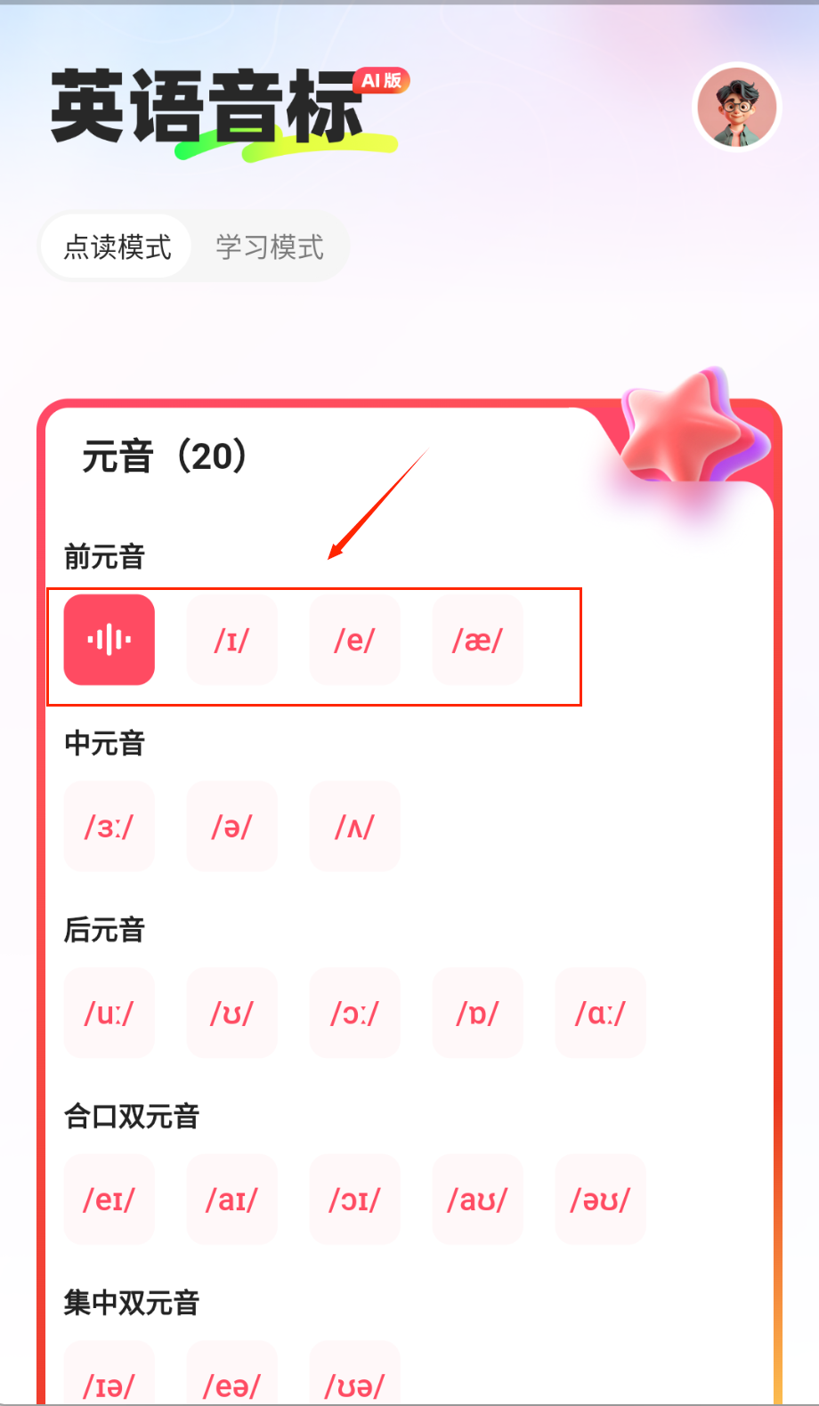 1、音标学习模块完整收录48个国际音标的标准发音示范,每个音标都配有详细的发音要点解析和练习指导。