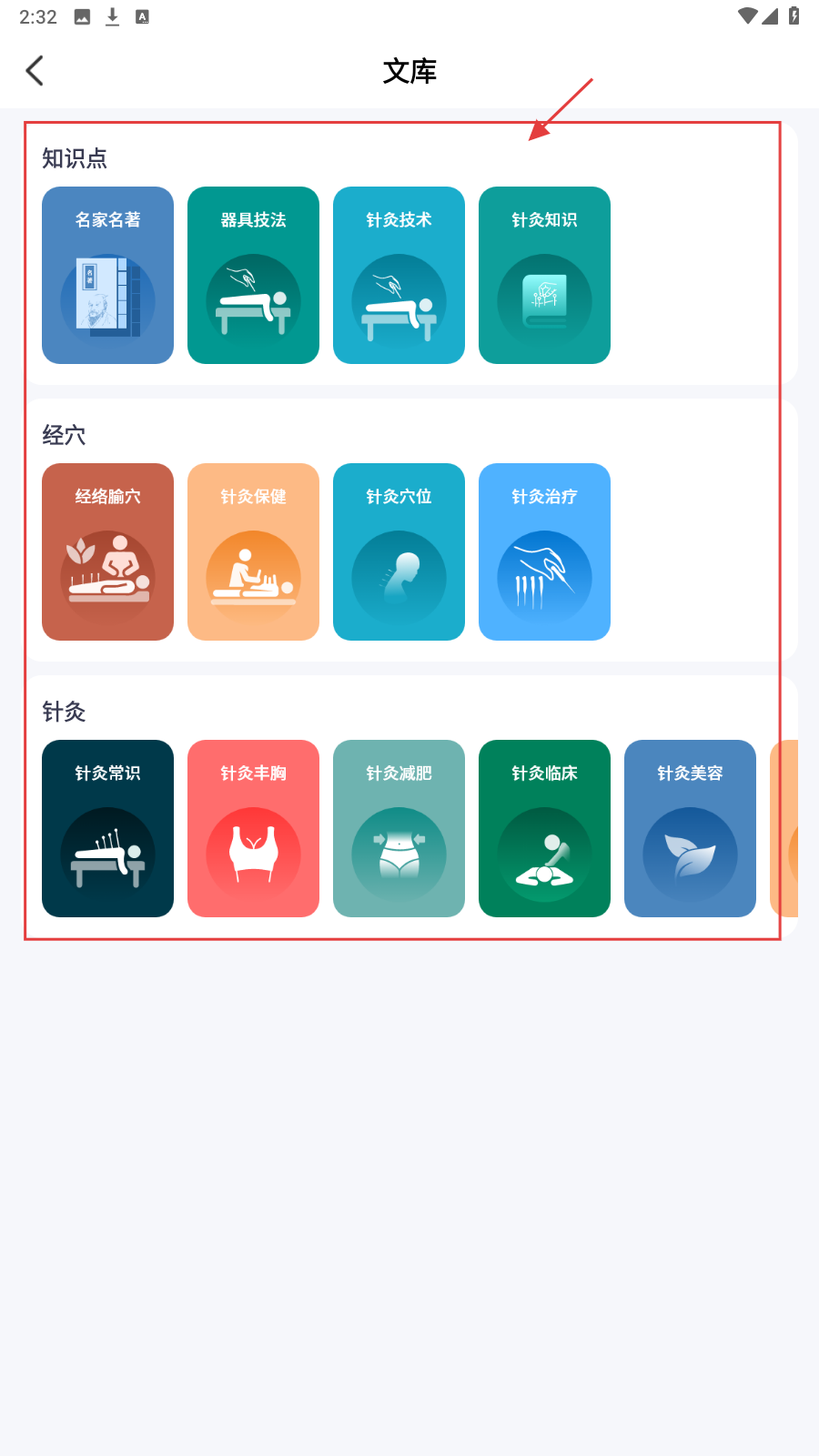 4、切换【文库】,从知识点(名家名著)、经穴(经络腧穴)、针灸(针灸常识)分类查资料拓展。