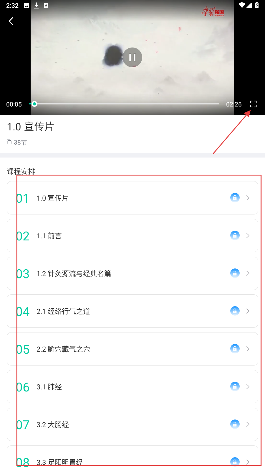 3、看视频时,用全屏功能,清晰观课。借课程目录,选章节(如肺经、大肠经)深入学。