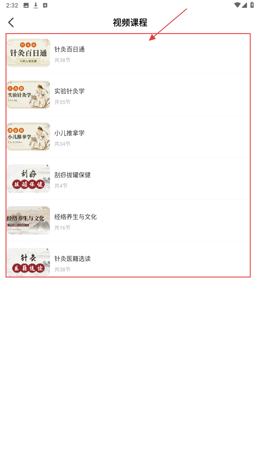2、点【视频课程】,选【针灸百日通】等课,按课程安排(宣传片、前言等)系统学。