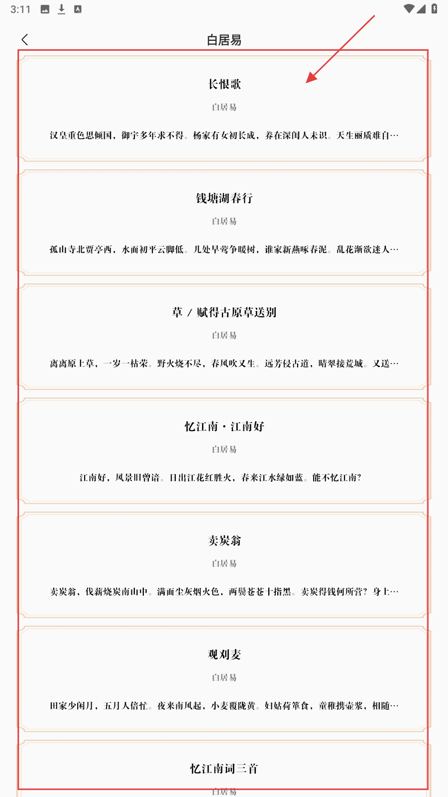 3、进入作者页,点选诗词(如白居易《长恨歌》),查看作品列表。