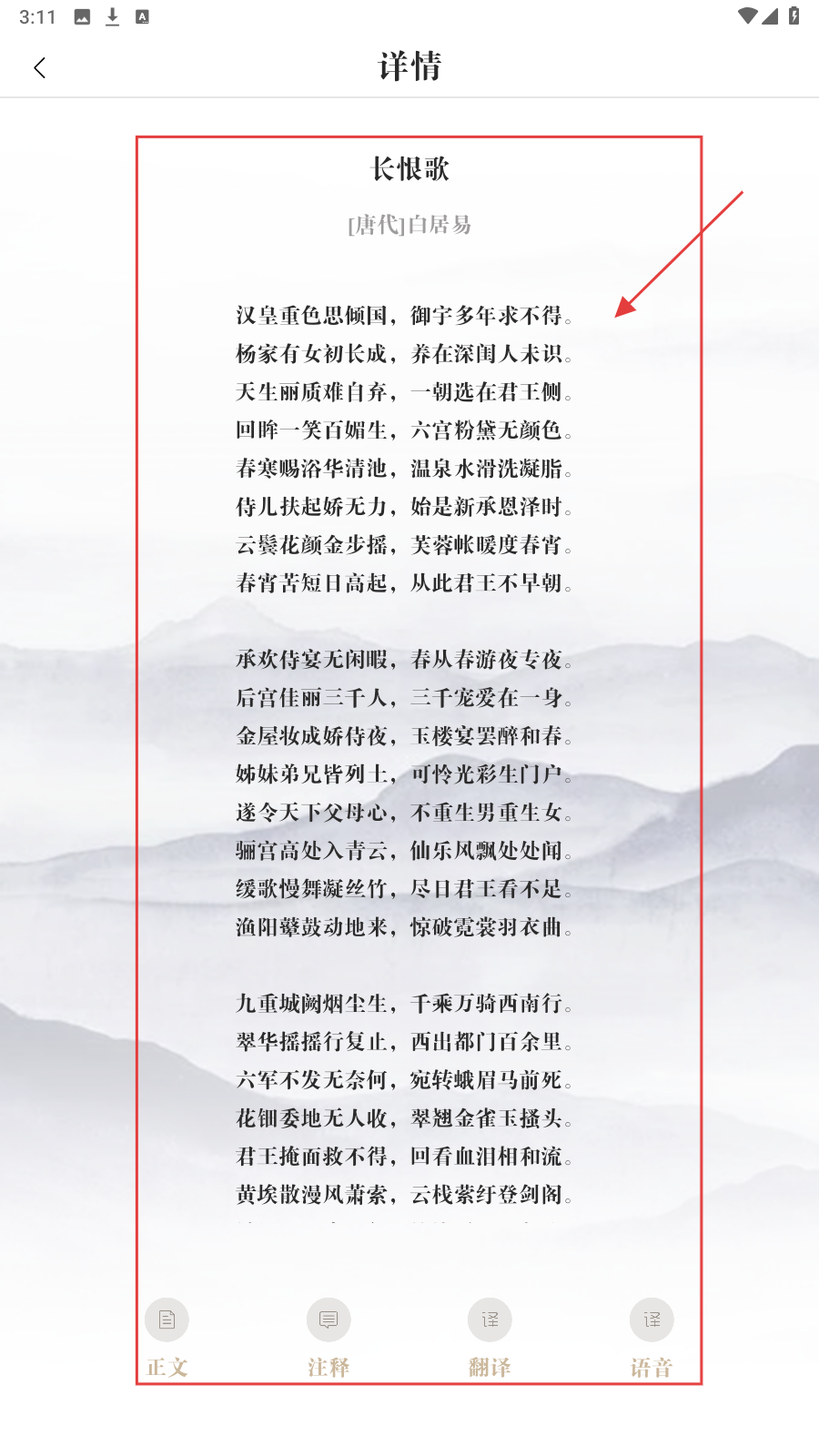 4、点击诗词标题,进入详情页,阅读全文,还可看注释、翻译。