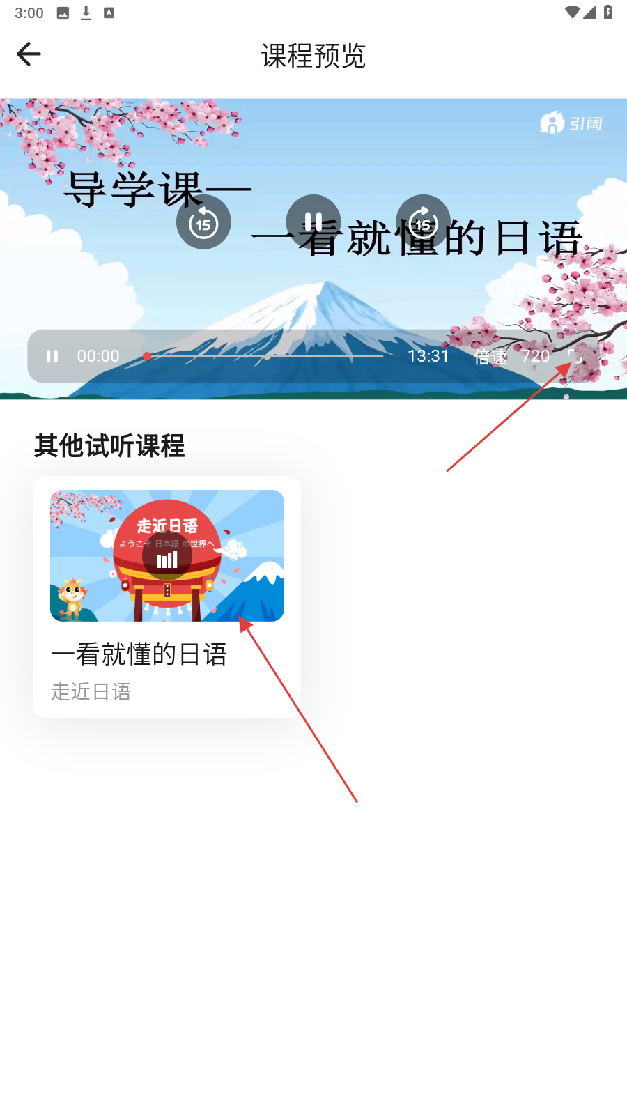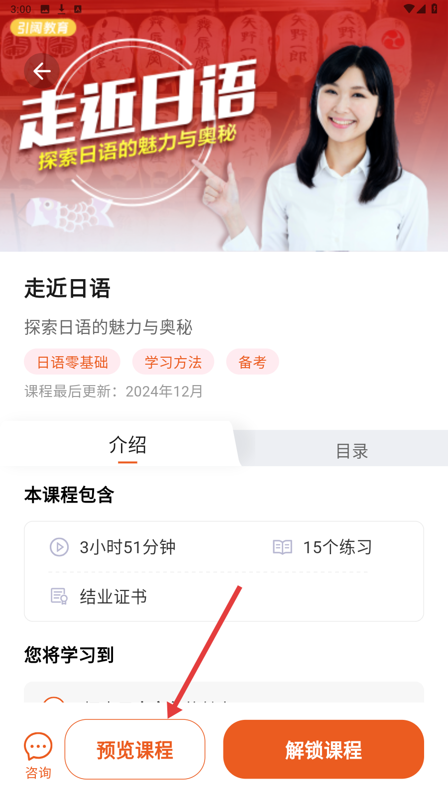 3、课程预览页,试听【导学课—一看就懂的日语】,体验教学风格与知识要点。