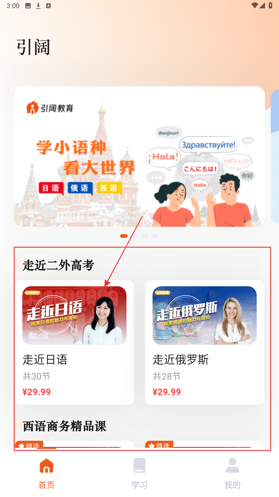 1、进入引阔APP,在【走近二外高考】板块选【走近日语】课程,开启日语学习之旅。