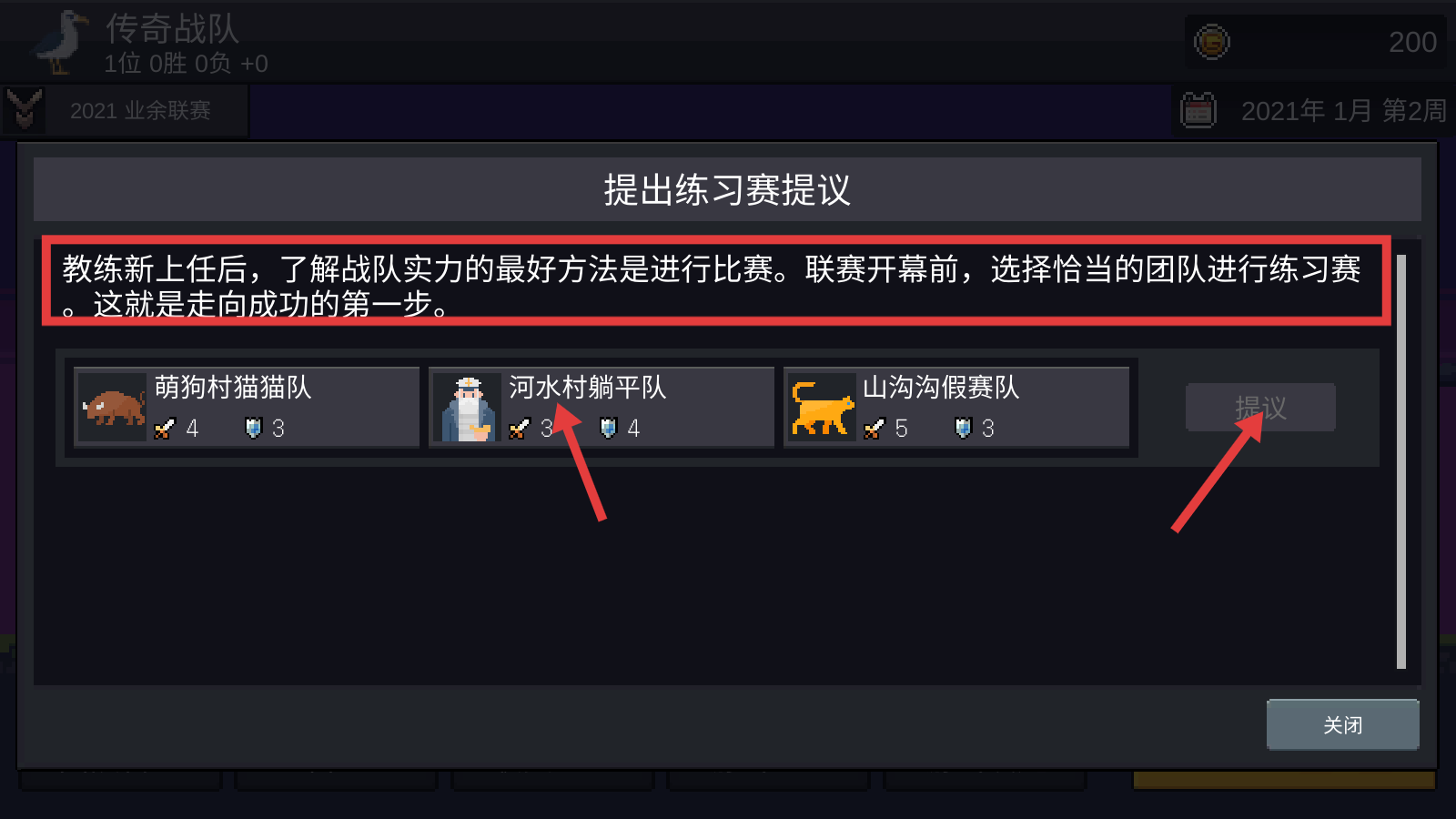 4、联赛前,选择“河水村躺平队”等对手,点击【提议】练习赛,磨合战队。