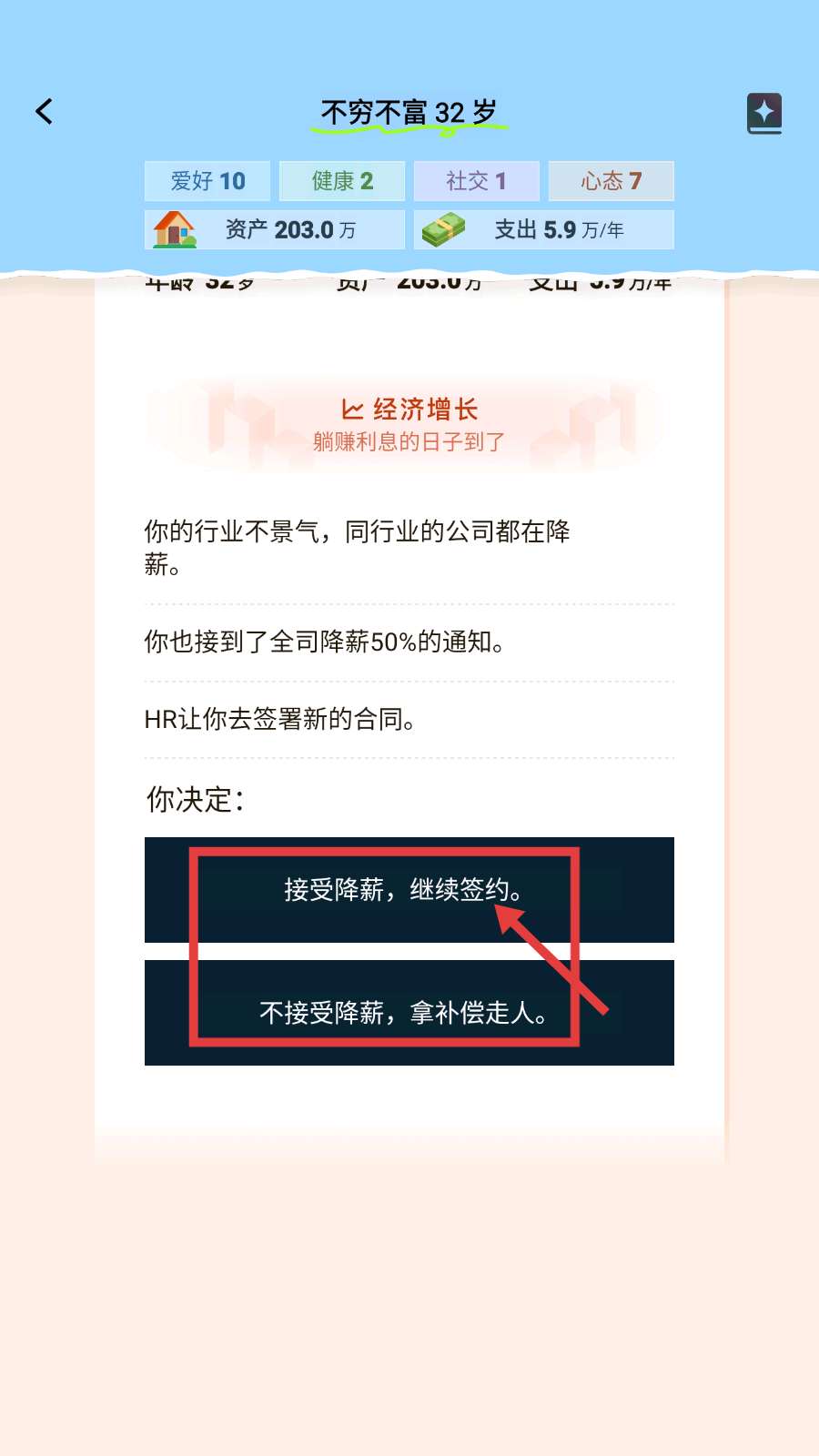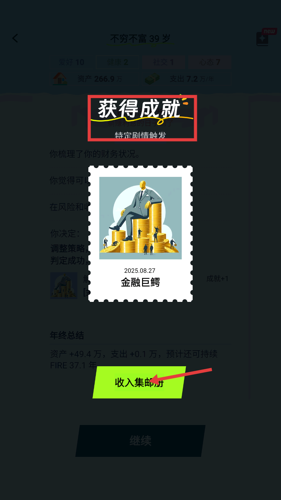 3、成就系统:达到特定数值解锁成就卡牌,获得额外奖励,最终目标为资金足够支撑退休,失败则需继续工作积累资金。