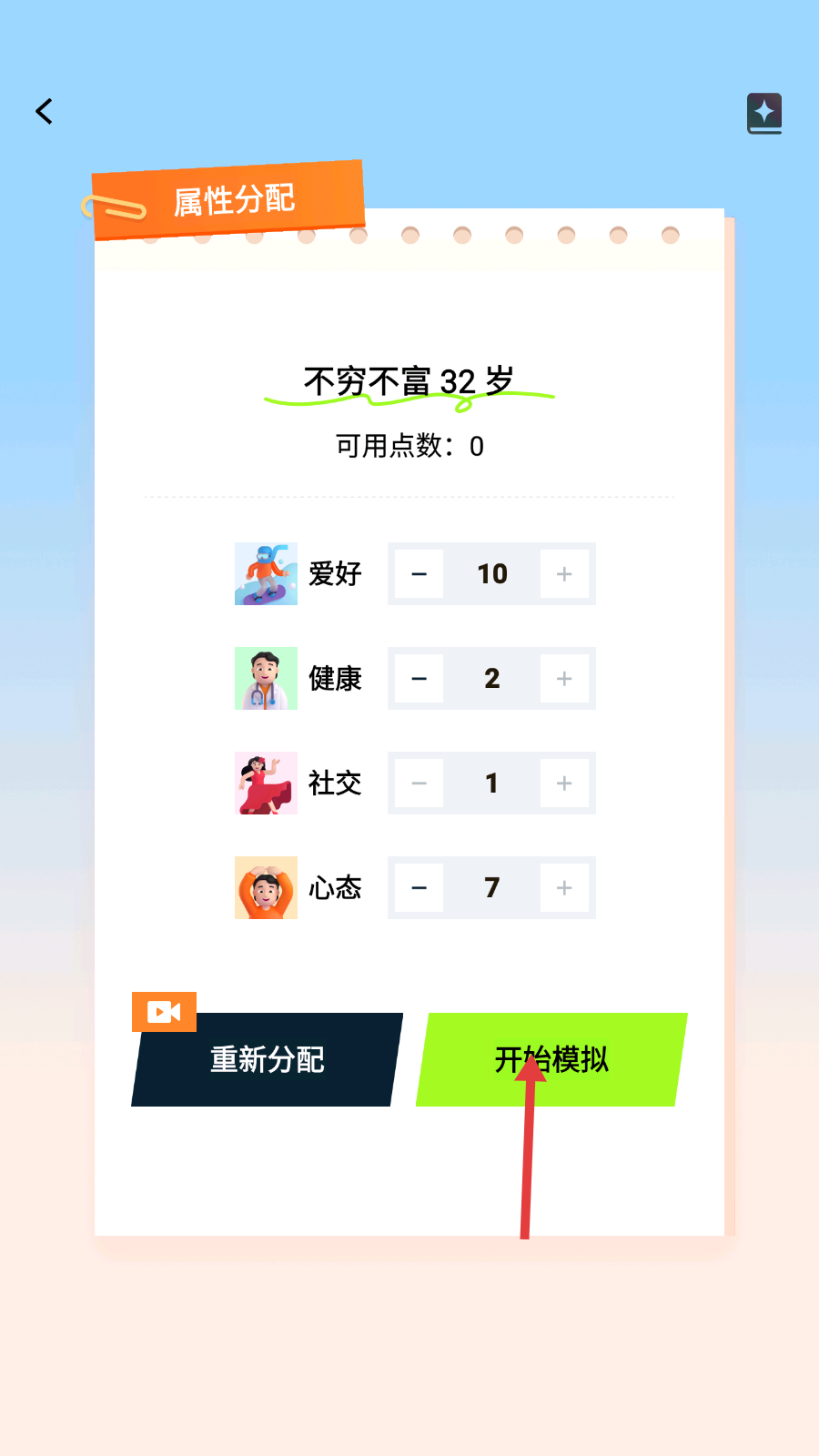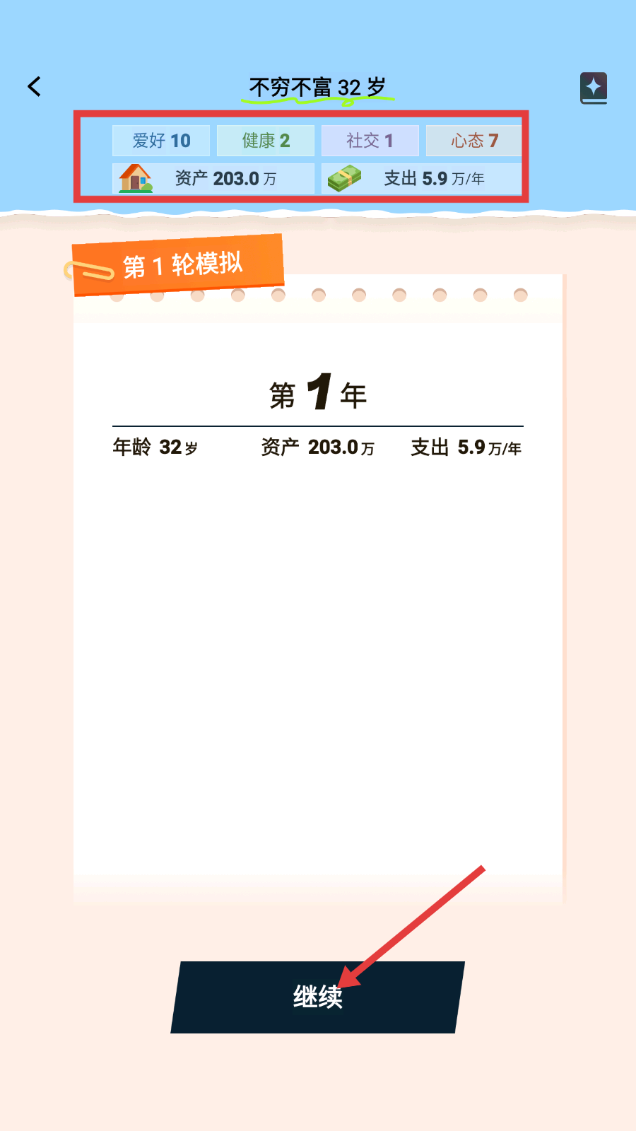 1、模拟过程:从财富积累到退休的整个流程,玩家通过分配属性和设置个人资料开始模拟,经历不同阶段决策和事件。