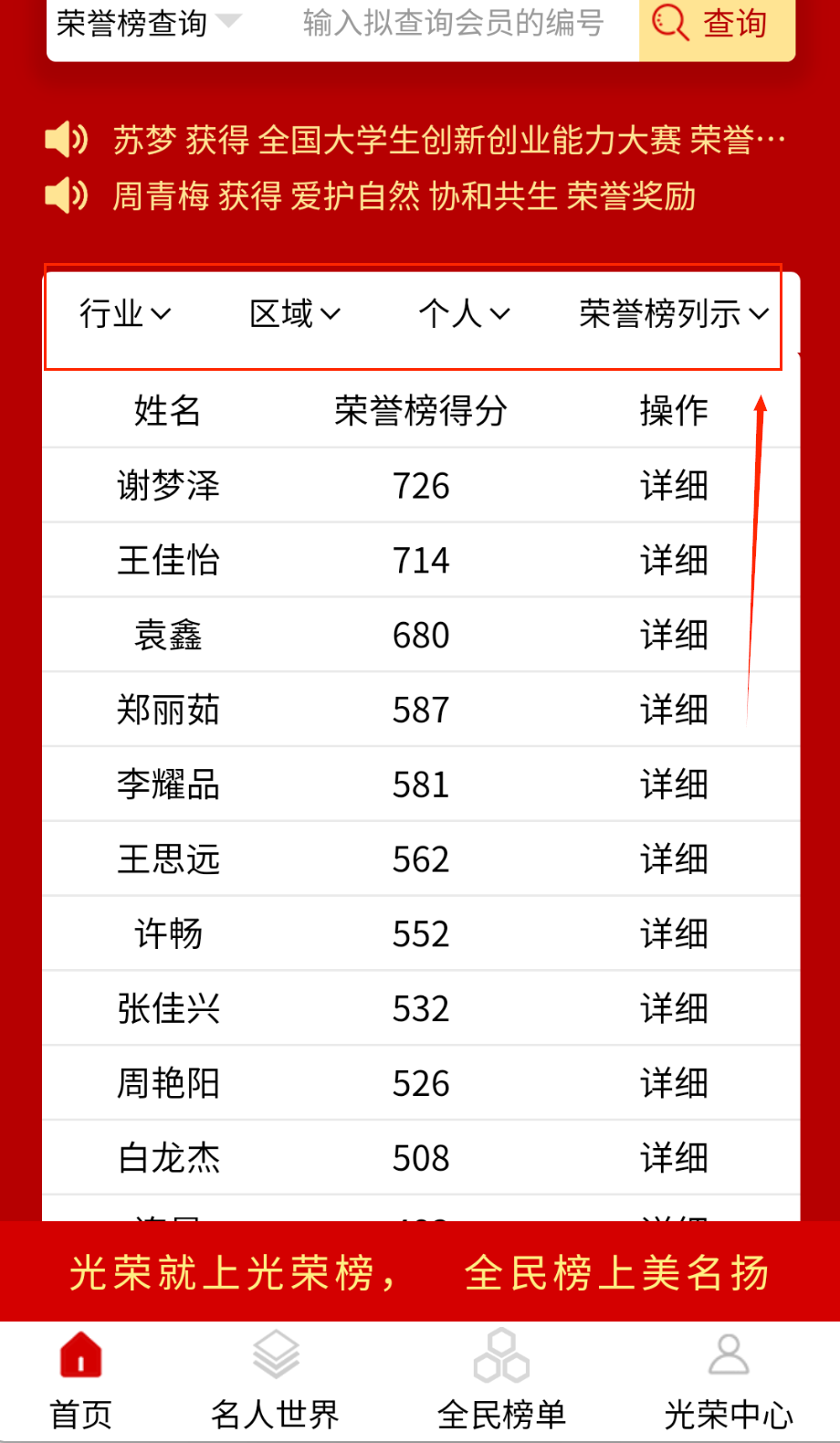 全民光荣榜汇集各类荣誉榜单和先进人物信息,平台提供详细的榜单查询和个人荣誉展示功能,创新的筛选系统和数据分析帮助深入了解荣誉详情,简洁的界面设计和个性化推送优化使用体验,是查询社会荣誉、学习先进事迹的正能量平台。