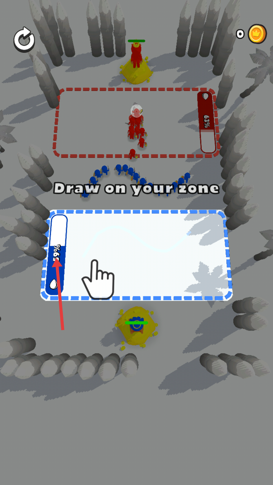 2、绘制路径将消耗【59%】资源,引导蓝色单位移动,全力占领红色虚线区域扩大优势。