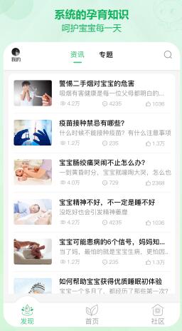 3、推荐孕育知识,并订阅感兴趣的专题,每个资讯都标注了浏览数、评论数和点赞量。