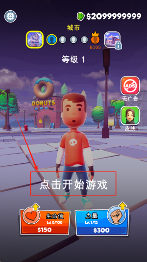 2、进入关卡准备:在城市界面点击“点击开始游戏”按钮开始第一关。