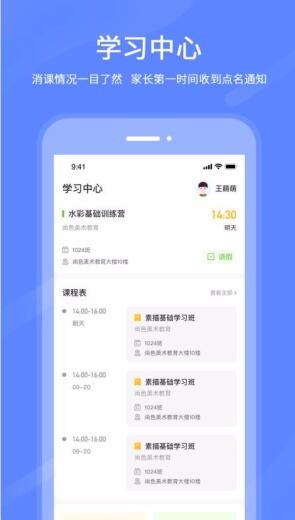1、提供专属学习中心,停课情况一目了然,家长第一时间收到点名通知,支持你学习。