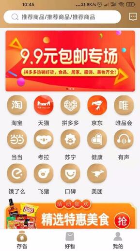 《存省》是一个可以省钱又省钱的购物平台,软件主要以商品对比和优惠服务为主,所以导购的首要设计要求也是围绕申请购物的主题。根据平台的省钱对比主题,面向用户开放。 商场入口众多,包括考拉、苏宁、口碑、飞猪等众多商场入口,通过这些入口可以进入各大商场满足购买服务。